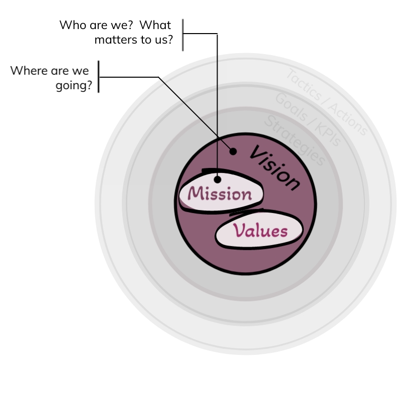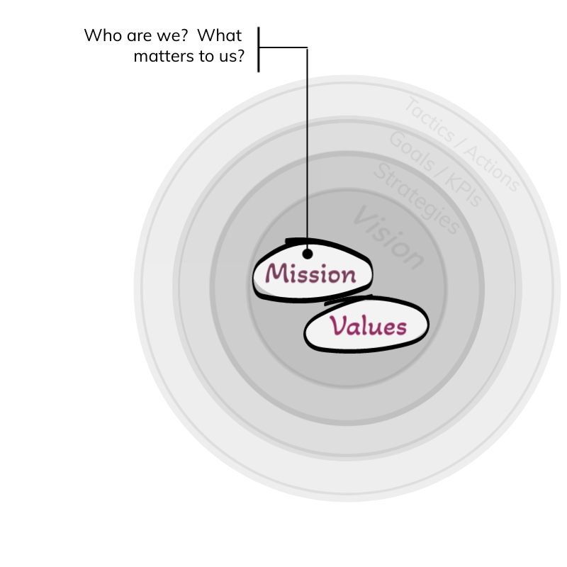 With mission, vision, and values in hand, you can craft the remaining pieces relating to goal setting.