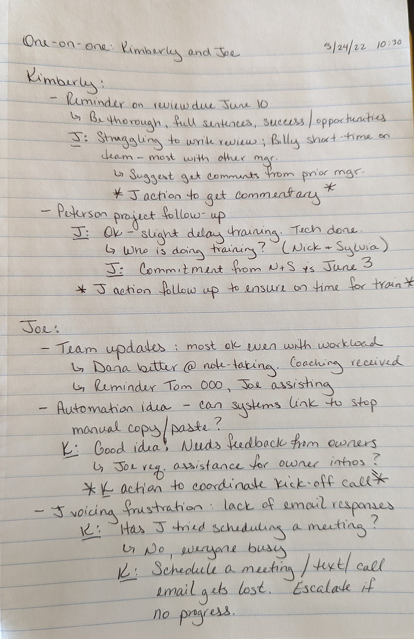 This is an example of hand-written notes in a simple notebook.  Although not as tidily formatted, you can still determine comments from Kimberly or Joe (noted by K: / J:) and any action items (noted by asterisks *).