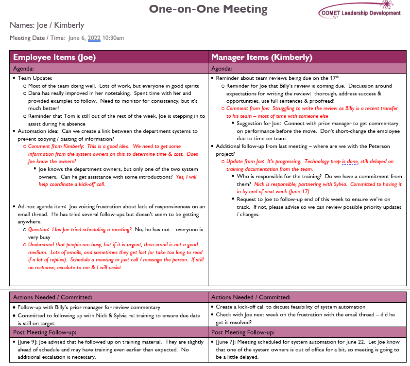 This is a sample set of notes for a one-on-one meeting between Kimberly and her employee Joe.  In this sample, we utilize red italicized text for updates from Kimberly on Joe’s topics and vice versa.